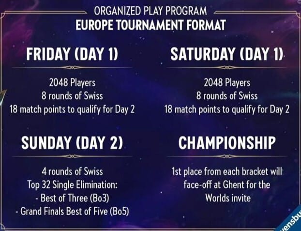 Il torneo ospiterà un totale di 4096 player di cap, ma divisi in due “sotto-DLC” giocati separatamente. Venerdì si giocheranno i primi 8 round di svizzera per 2048 player mentre il Sabato altri 8 per i restanti 2048 giocatori.