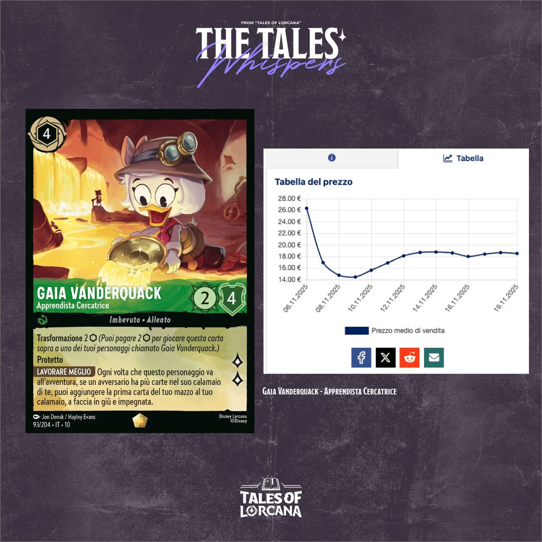 La parte interessante è quello che succede dopo: dal 10/11 in avanti il grafico disegna una risalita costante, con il prezzo medio che si riassesta stabilmente nella fascia 18–19 €. Una curva a “V” che, in Lorcana, di solito racconta due cose: risultati concreti sul tavolo e nessun vero sostituto nel ruolo.